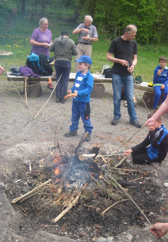 Auf halben Weg der 3,5-stündigen Wanderung wurde mit Begeisterung eine Grillpause eingelegt und die Kinder sammelten Feuerholz. An Stöcken wurden Würstchen gegrillt. Nach der wohlverdienten Pause ging es weiter in Richtung Wasserfall. Unterwegs zeigte uns Meinrad Sailer die Reste einer ehemaligen keltischen Siedlung.