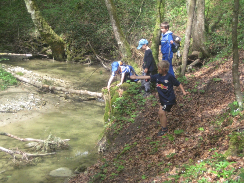 Am Sonntag, den 26.04.2015 machte die Familiengruppe sich auf, den Schmalegger Tobel zu erkunden. Bei schönstem Wanderwetter trafen sich zwölf Kinder mit ihren Eltern wie gewohnt in Wangen und fuhren gemeinsam Richtung Schmalegg bei Ravensburg. Auf schmalen Wegen ging es hinab durch den urigen Bannwald zum Tobel.